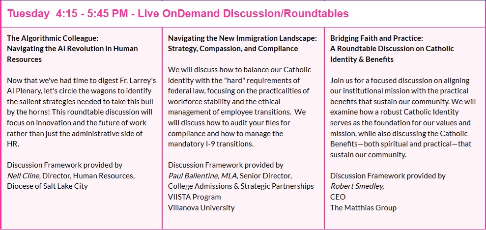 NACPA's annual convocation allows members to learn from experts in HR and the world of HR in the Church; from those who have succeeded in creating a better and more prosperous environment, through the field of HR, within their communities. During the three-day meeting, delegates attend a spirited Opening Ceremony, uplifting prayer services, and networking opportunities. They will hear from outstanding Plenary speakers; select 4 compelling breakout sessions, from a choice of 12; participate in a hot topic round table (out of 3), welcoming forums, as well as post-session and speaker chats, and will be able to meet face-to-face with vendors specific to the fields of HR and HR within the Catholic Church.