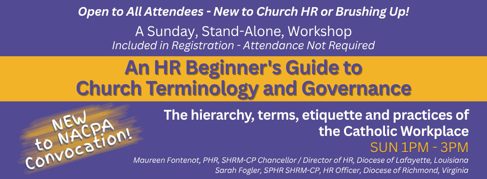 Do you ever wonder what a particular term means in relation to the Catholic Church, or why the Church follows certain practices? Have you asked yourself what the proper way is to address a member of the clergy? This session is designed to answer those questions and more—providing HR professionals with a practical introduction to the language and governance of the Catholic Church.