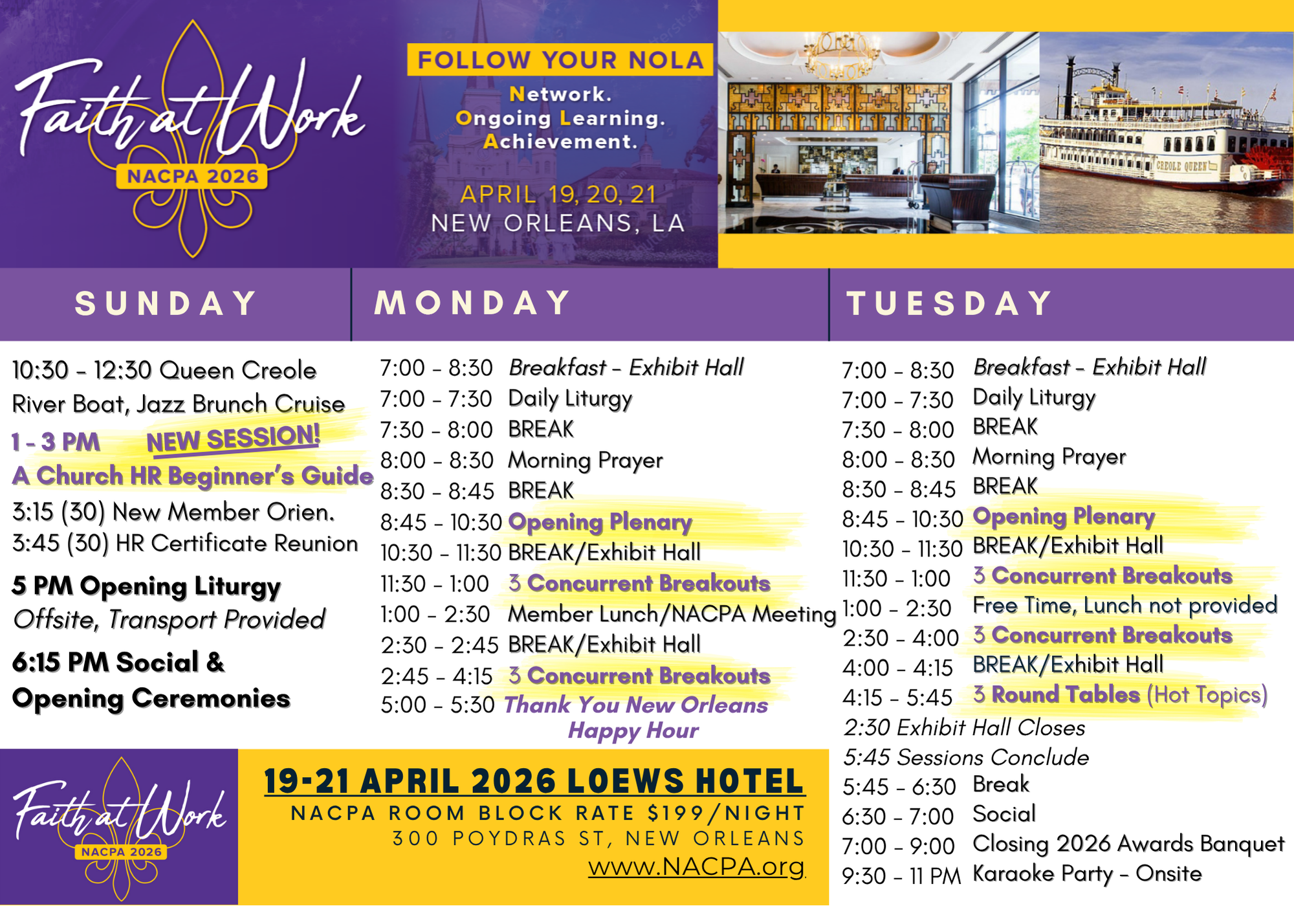 NACPA's annual convocation allows members to learn from experts in HR and the world of HR in the Church; from those who have succeeded in creating a better and more prosperous environment, through the field of HR, within their communities. During the three-day meeting, delegates attend a spirited Opening Ceremony, uplifting prayer services, and networking opportunities. They will hear from outstanding Plenary speakers; select 4 compelling breakout sessions, from a choice of 12; participate in a hot topic round table (out of 3), welcoming forums, as well as post-session and speaker chats, and will be able to meet face-to-face with vendors specific to the fields of HR and HR within the Catholic Church.
